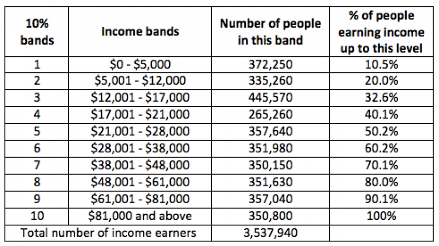 Some other information from the same source but not shown in the table: the top 5% of taxable income earners in New Zealand earn $107,000 or more, and the top 1% of income earners have taxable incomes of about $200,000 or more.