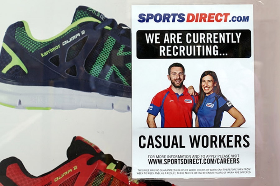 Sports Direct recruitment poster in a store window, July 2016. Photo: Richard Gardner / REX / Shutterstock